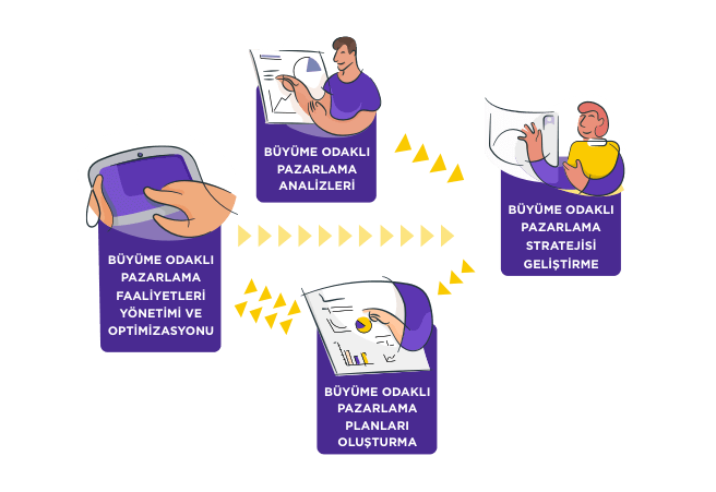 Marketing Machine platformunda, 4 büyüme alanında taktik üretiyoruz: Reach/Attract, Engage/Convert, Nurture/Close ve Retain/Grow. Bu aşamada, ilgili Growth Funnel’lar ve personalara göre yapılacak pazarlama eylemlerini belirlediğimiz Büyüme Odaklı Pazarlama Planları ve Büyüme Taktikleri oluşturduk.
